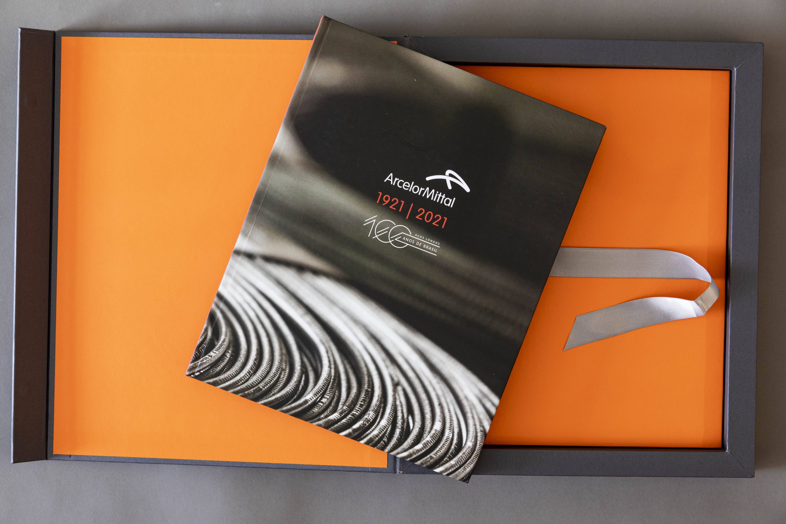 Quando a websérie entrou para o processo de edição, a produção do livro “ArcelorMittal 1921 | 2021” foi iniciada. A NITRO tinha apenas dois briefings: se pautar pela linha do tempo da empresa e fazer um livro com exatas 100 páginas. “Novamente tivemos total liberdade para criar o conceito gráfico, na verdade fomos convocados a trazer algo novo em termos de design e acertamos muito. O livro, feito em parceria com a designer Fabiana Ferraresi, ficou lindo, é uma obra que impacta, que foge aos modelos tradicionais de livros corporativos, tem um design impactante, vem numa caixa. Todo mundo ama.”